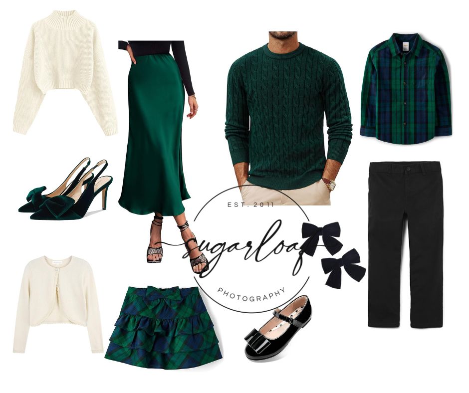 Monochromatic outfits always photograph beautifully, especially in our white and black Christmas set. Try sticking to one main color family. All black, all red, all green, all gold, all navy, all silver….