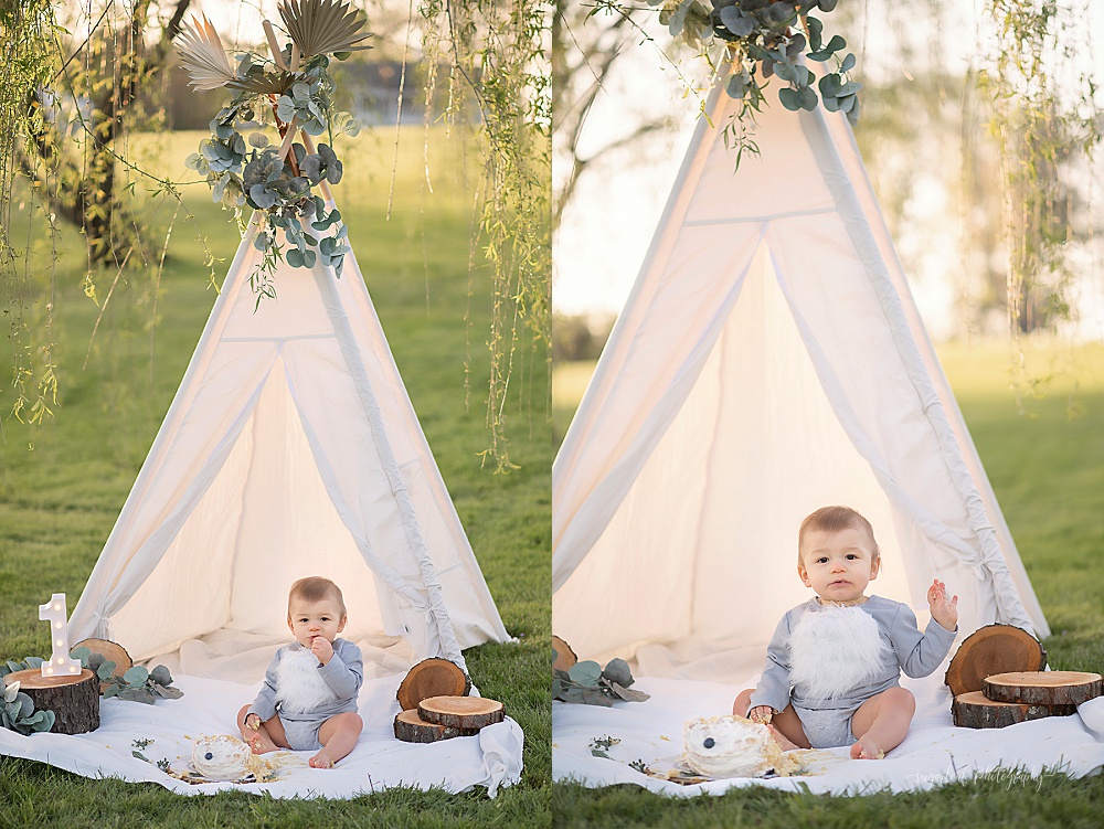 Sweet Beau has grown so much since our last session!! He was full of personality at his 1st birthday Spring Outdoor Cake Smash Session. He celebrated with an organic color scheme to match nature for his cake smash! Getting messy is so much fun, even when babies are not too interested on the cake. I hope you enjoy his birthday pictures.